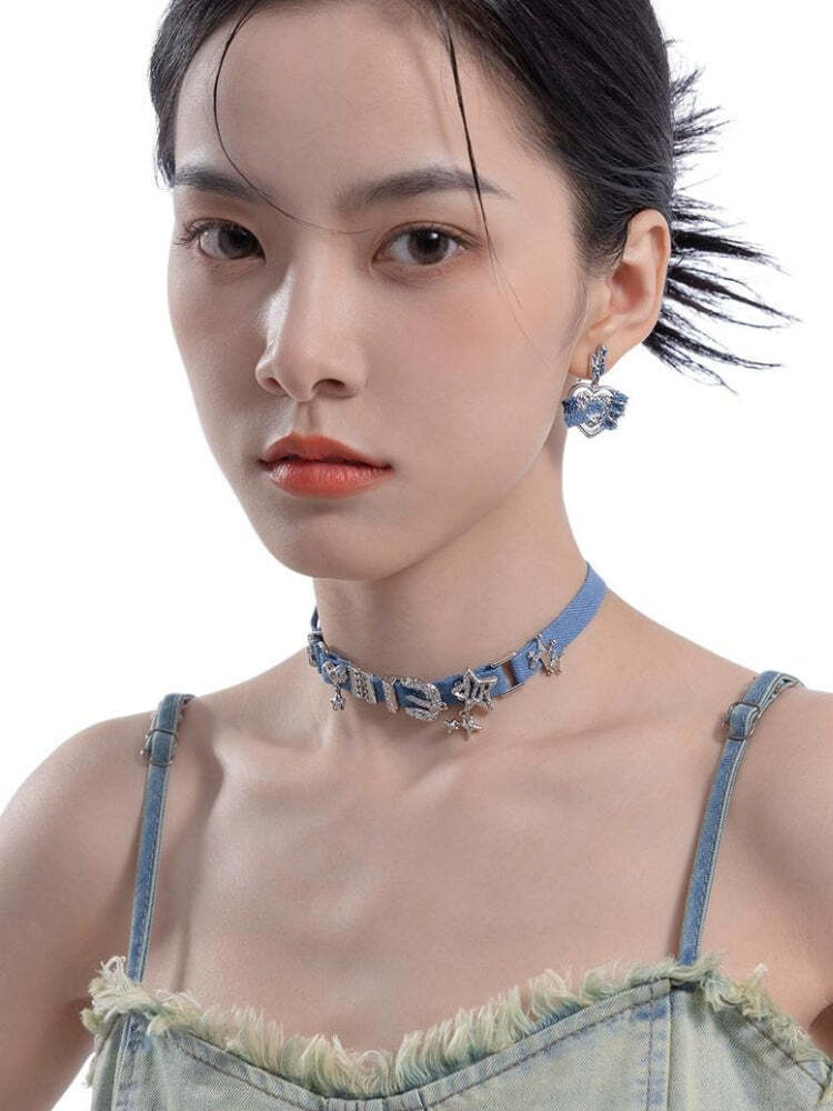 Y2K Sparkle Denim Choker Necklace High-quality product featuring 2000s fashion, 90s fashion, outfit inspo and more. Modern design that fits the latest trends. Premium materials ensure durability and comfort. Order now for special offers! Product designed with attention to every detail. Suitable for all occasions and personal styles.
