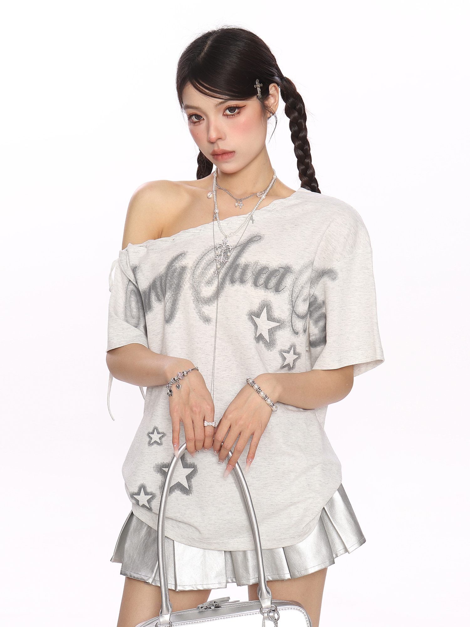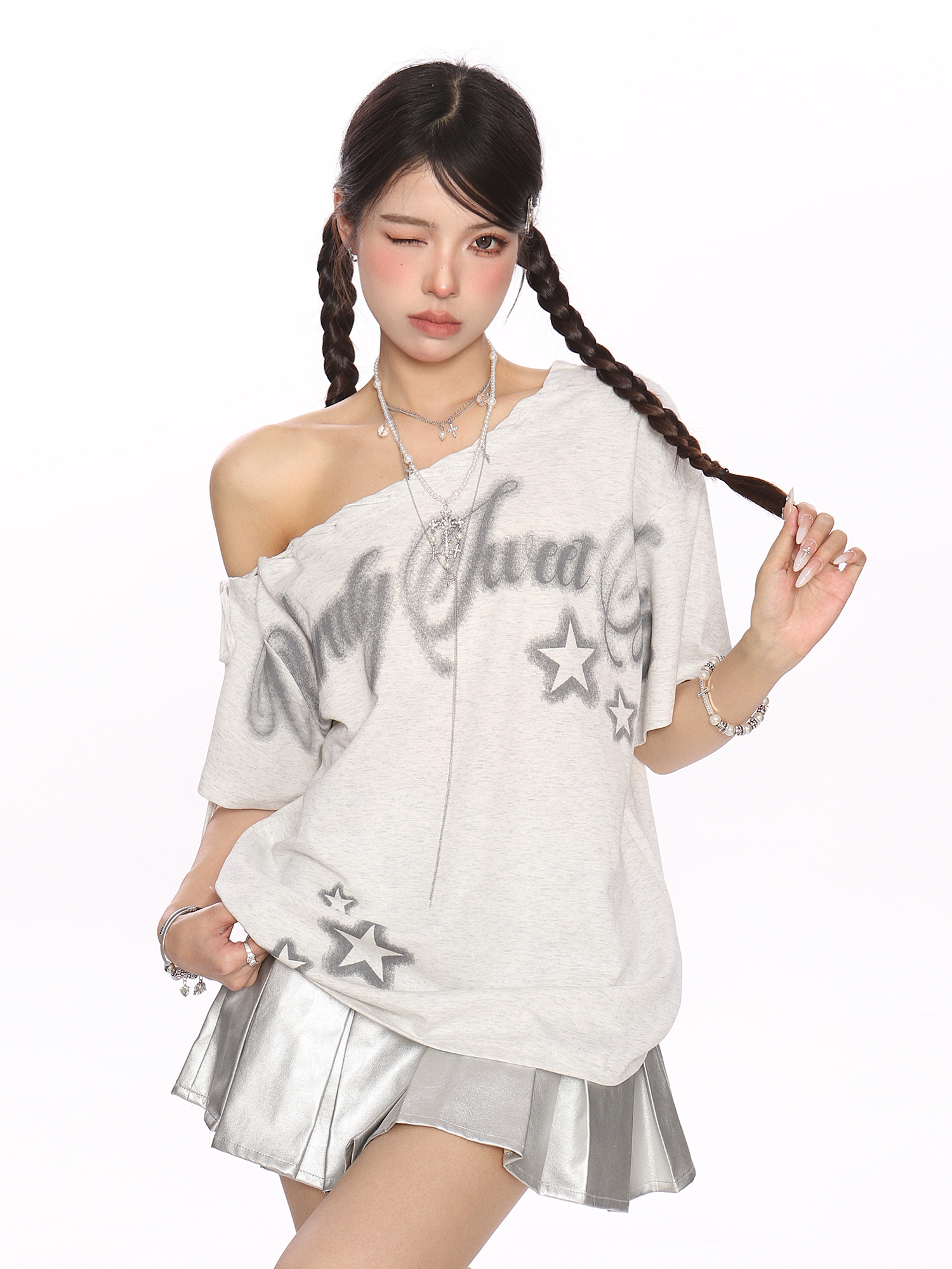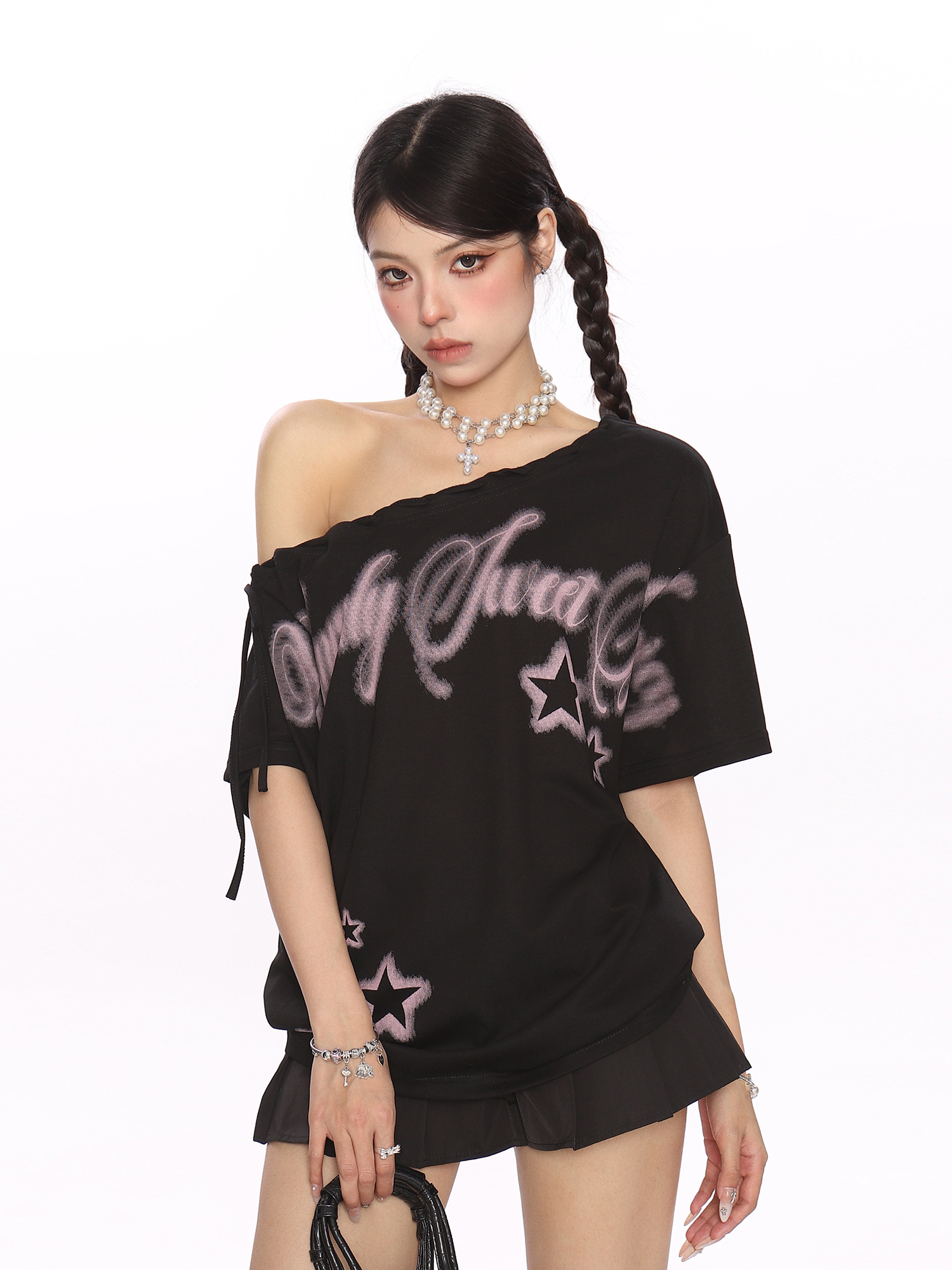 Y2k Star Graffiti Off Shoulder Short Sleeve Women Slim Fit Strap Should – Y2k Outfits