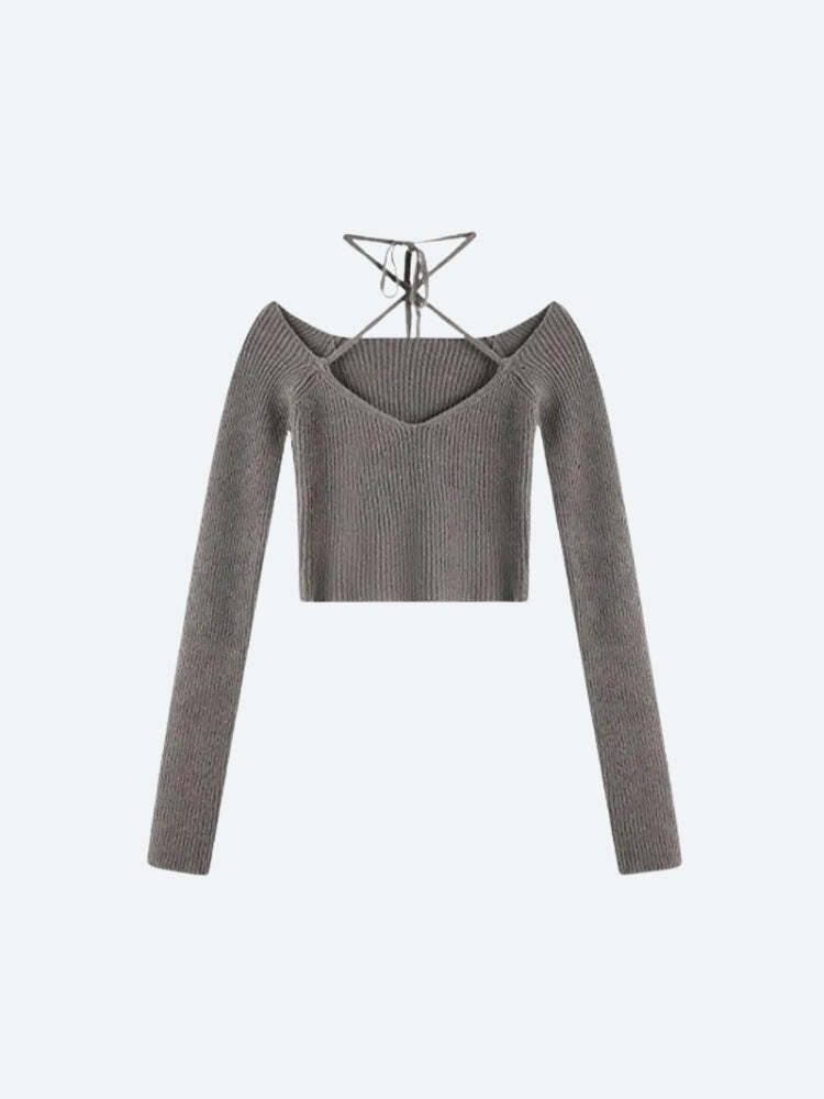 Bring Y2K vibes to your wardrobe with this halter neck tie crop top. The cozy knit fabric and cropped cut make it a perfect match for high-waisted jeans, skirts, or shorts, adding a stylish twist to your look.