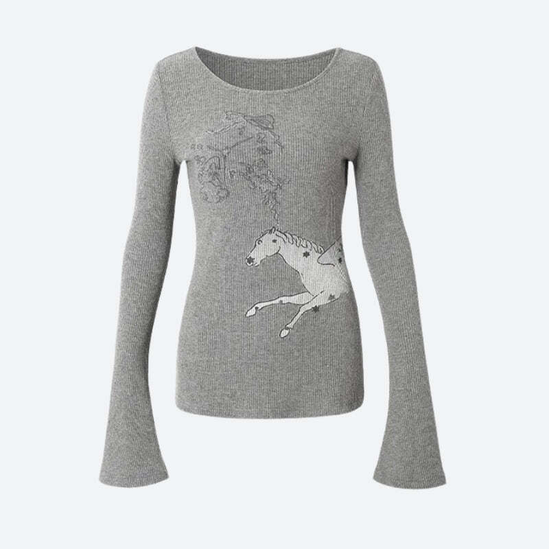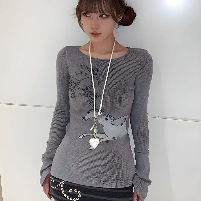 Y2k White Horse Ribbed Top – Y2k Outfits